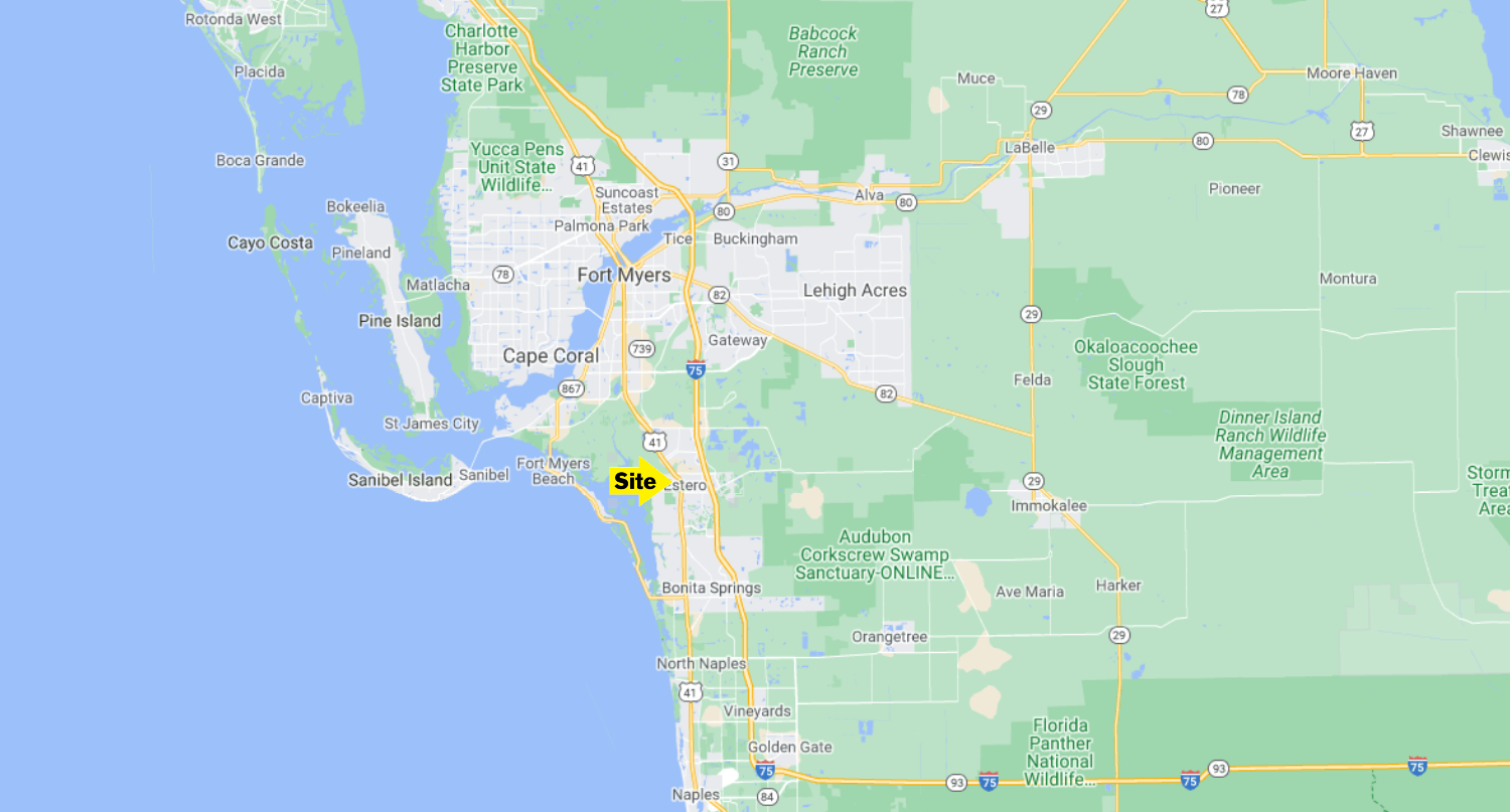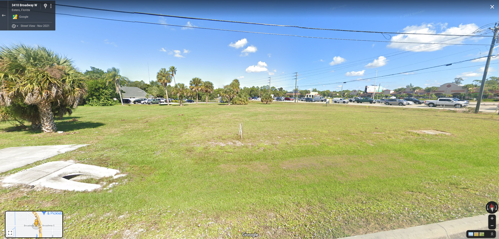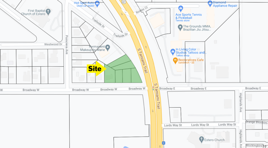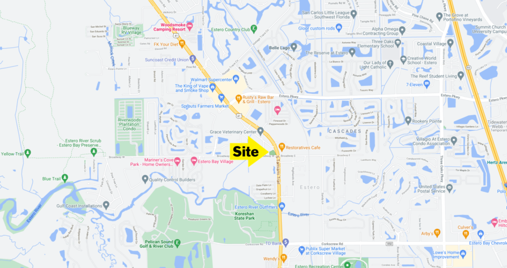 Exclusive vacant commercial lot on signalized corner at Hwy 41 / Broadway in Estero, FL (Lee County). Zoned CPD (Commercial Planned Development) – Perfect for retail, fast food location.